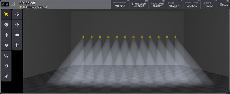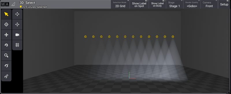 以下の例では、フィクスチャ1〜12が左から右の順でパッチされています。詳しくは ショーへのフィクスチャ追加 を参照してください。