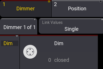 下の画面例では、Dimmer フィーチャグループが選択されています。この下にはフィーチャを示すボタン("Dimmer 1 of 1")が、さらに下には Dimmer フィーチャの最初のアトリビュート(Dim)を制御するエンコーダがあります。