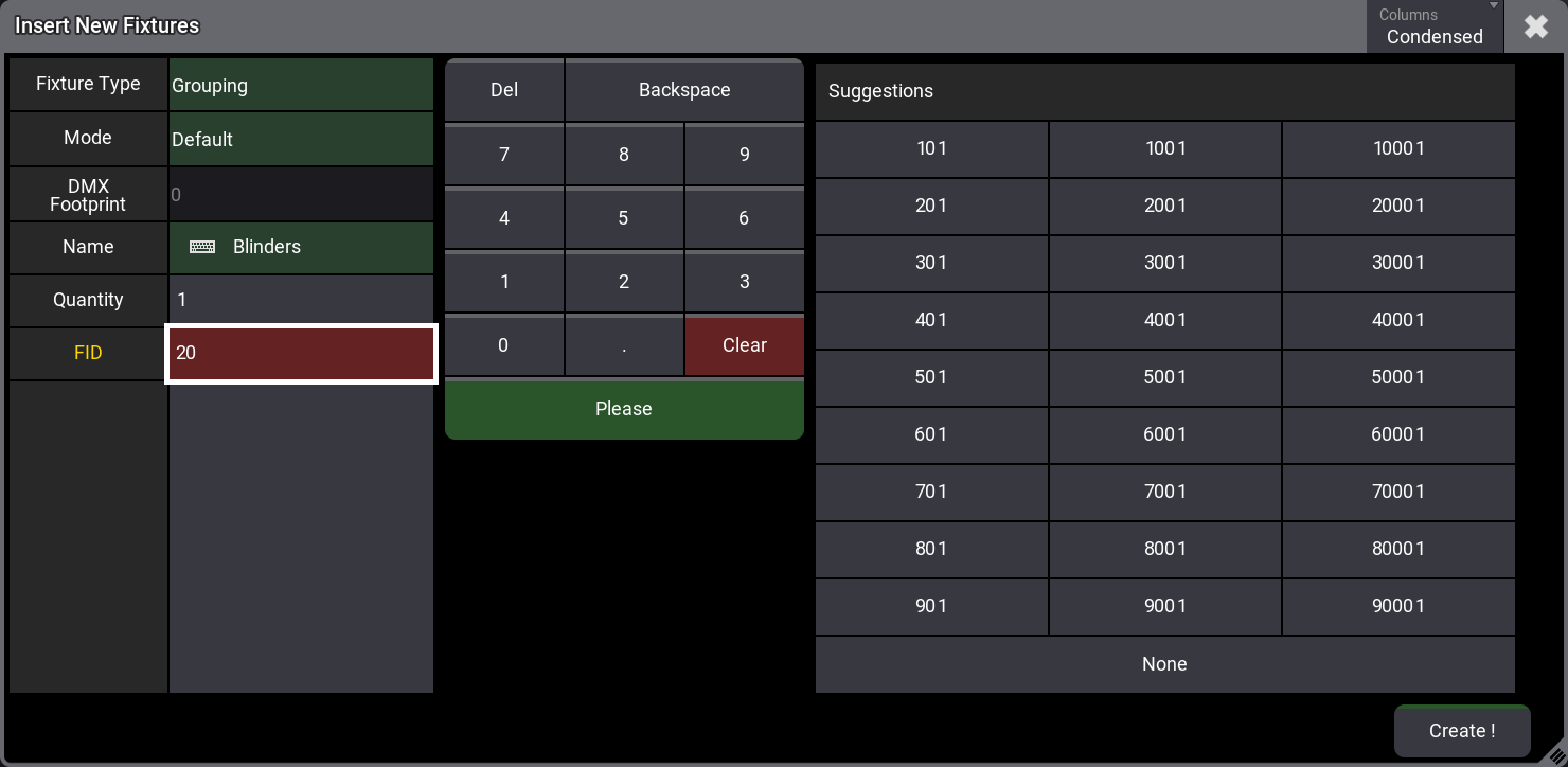 フィクスチャには Blinders という名前を付けます。必要なのは1つだけですが、FID を 20 にしたいので、FID 欄に 20 と入力します。すると、FID 欄の背景が赤になり、問題があることが示されます。