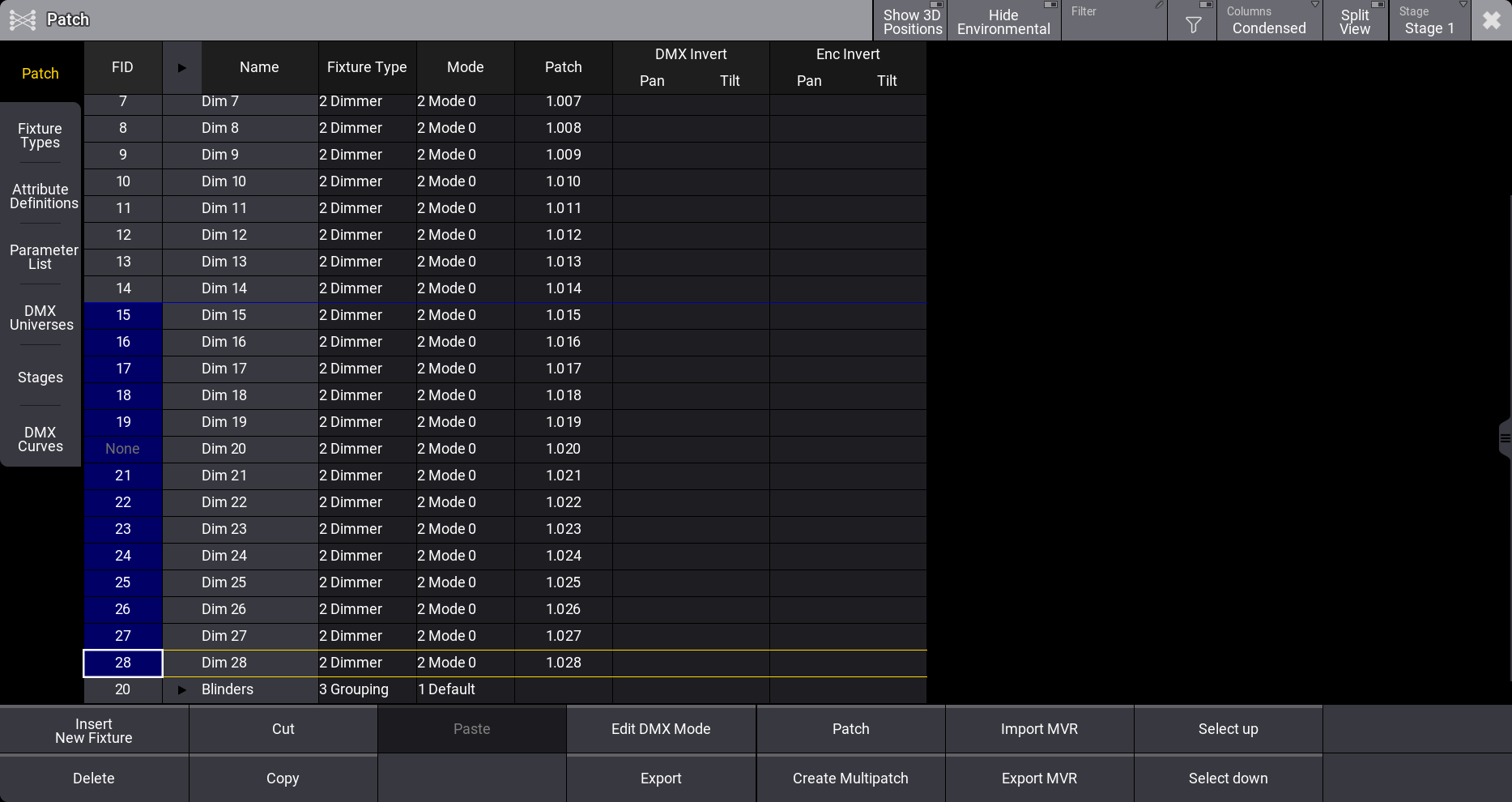 "Dim" に連番が振られた名前で、28のディマーができます。これらは、DMXユニバース1のアドレス1からパッチされます。