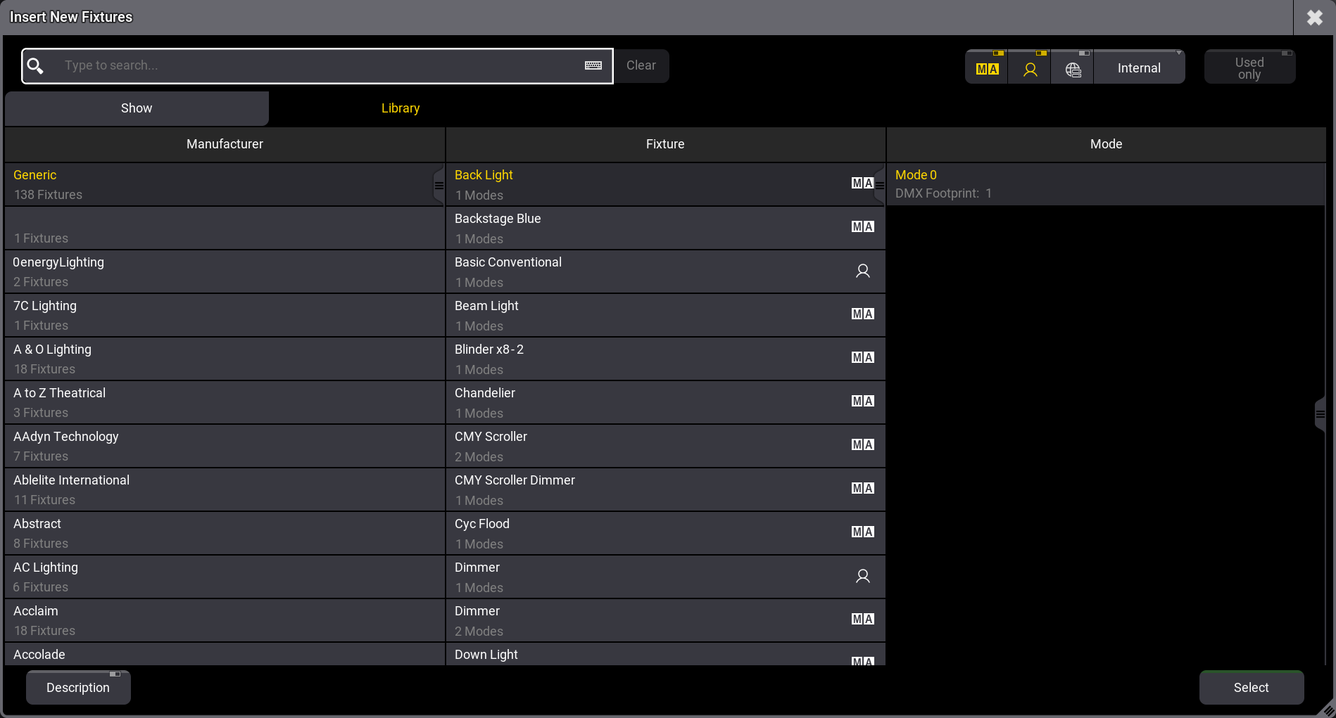 一覧は Library になっています。デフォルトは、MA およびユーザ・フィクスチャです。他のライブラリを選ぶこともできますが、最初のフィクスチャについてはこのままでかまいません。