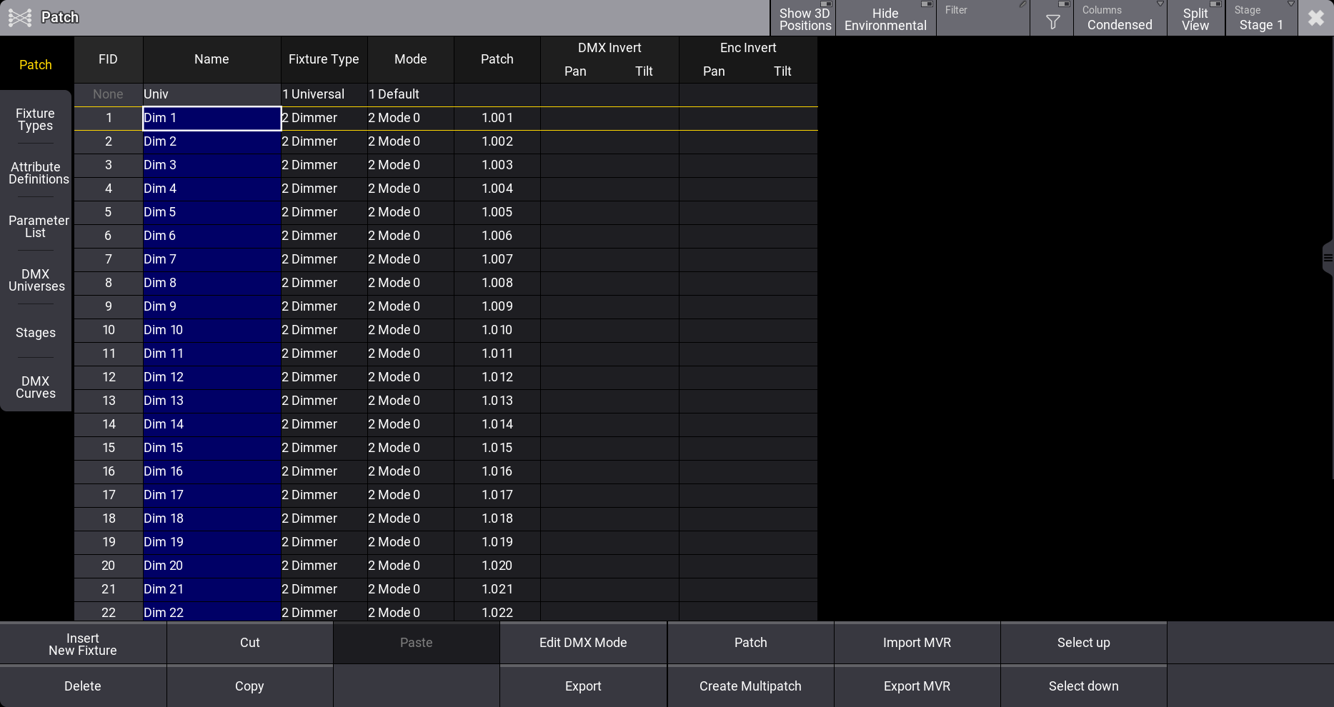 | 1 | Dim 1 | 2 Dimmer | 2 Mode 0 | 1.001 |