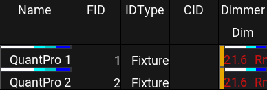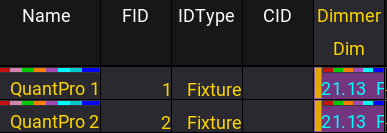 フィクスチャ1の Name と Dimmer 値の上にあるカラーインジケータは、プログラマでアクティブな情報を示しています。フィクスチャ2の Dimmer 値の上だけにあって、Name 上には表示されないインジケータは、シーケンスから出力された情報を示しています。