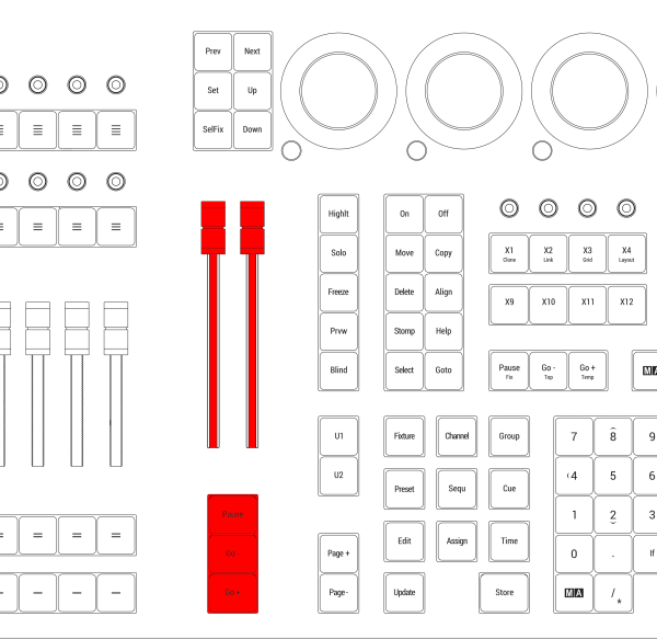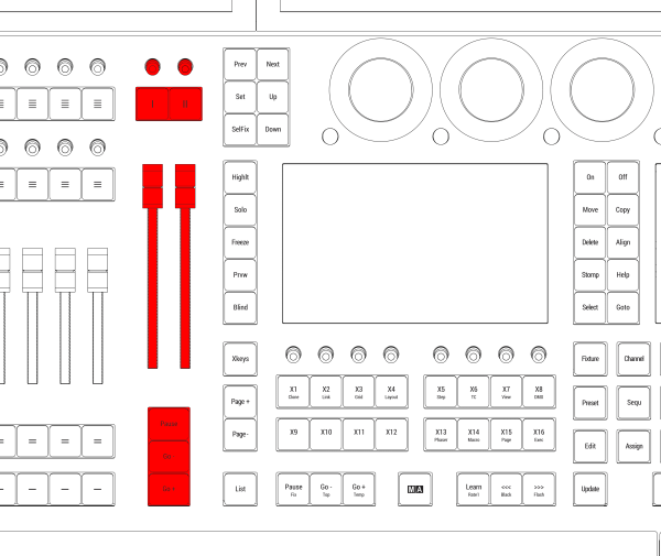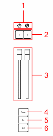 マスター・エリアの下部には、Go+ (大)、Go- (大)、Pause (大) キーがあります。これらのキーは、選択しされているシーケンスに対して Go、Go、Pause コマンドを実行します。