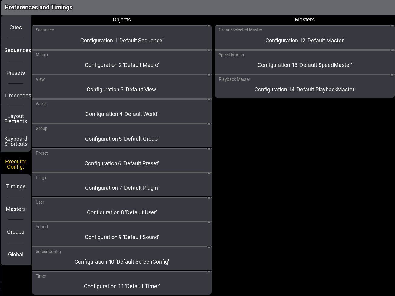エクゼキュータ・キーとフェーダの構成(Configurations)は、保存して再利用できます。割り当ての変更方法については、エクゼキュータへのオブジェクト割り当て を参照してください。