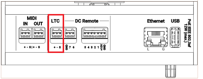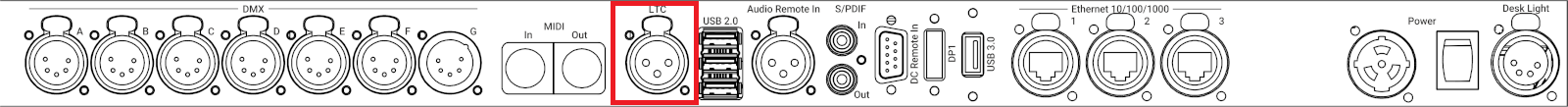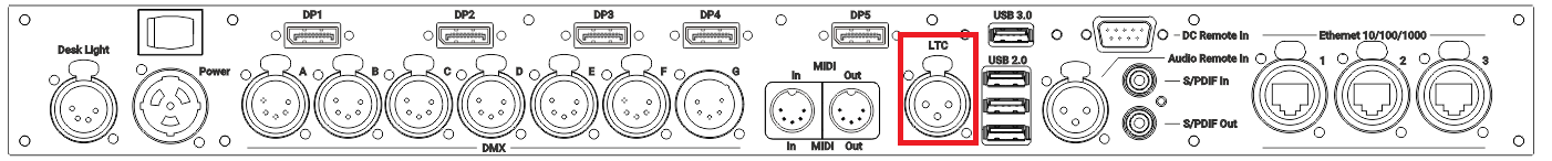 卓をSMPTEタイムコードと同期させるには、SMPTEソースをLTCポートに接続します。