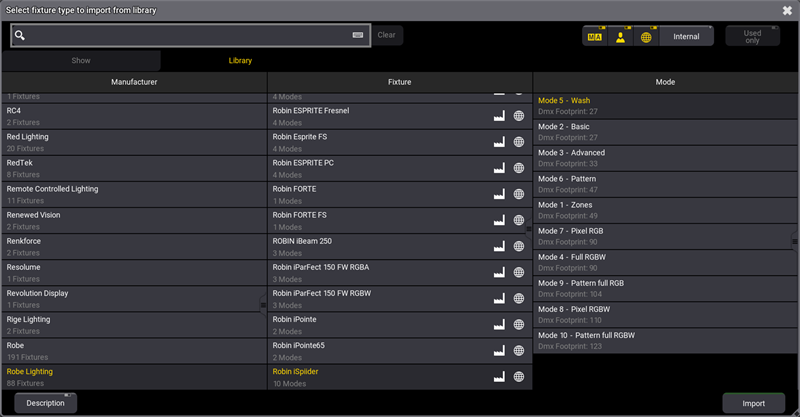 フィクスチャタイプを選択し、Select fixture type ウィンドウの右下隅にある Import をタップしてください。フィクスチャがフィクスチャタイプ・リストにインポートされ、パッチできるようになります。