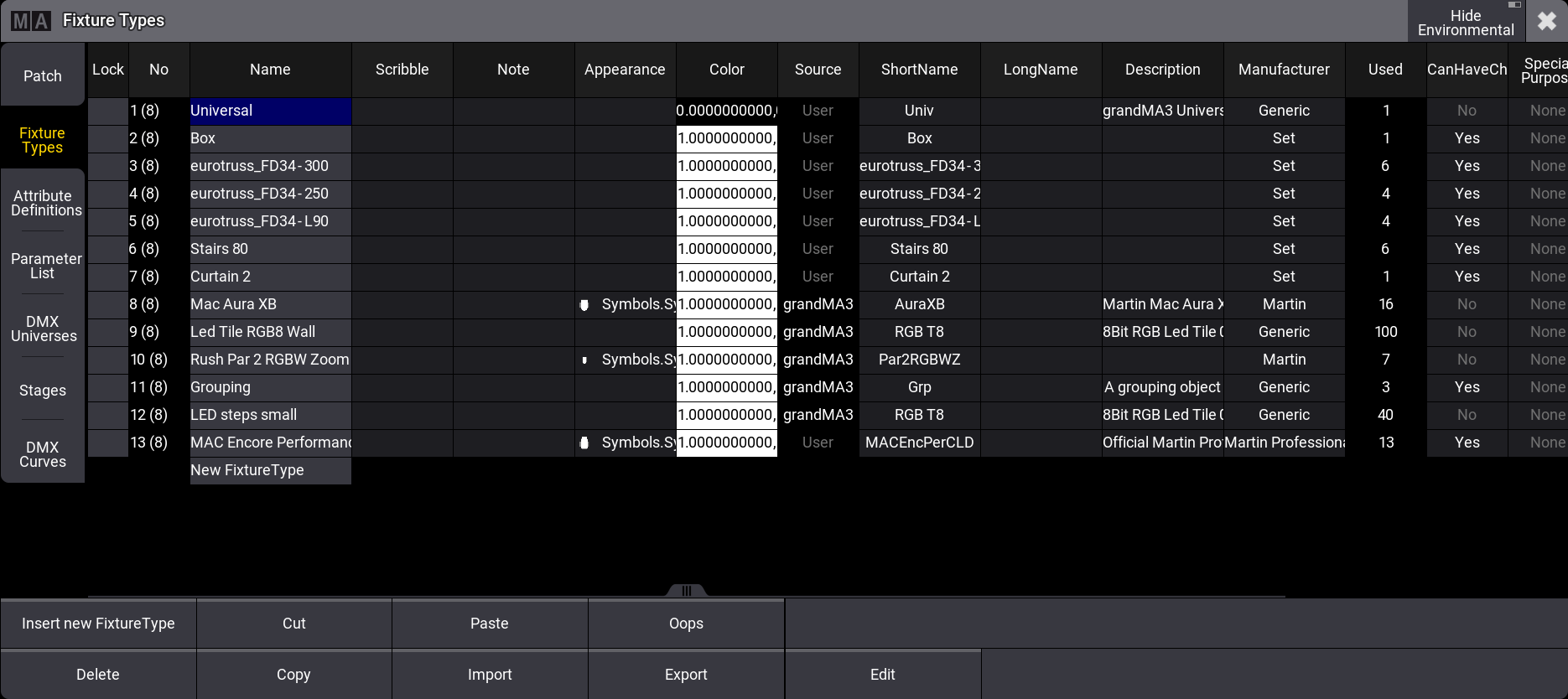 Patch ダイアログの左側バーにある Fixture Types をタップしてください。下の画面例のように、Fixture Types メニューが開きます。
