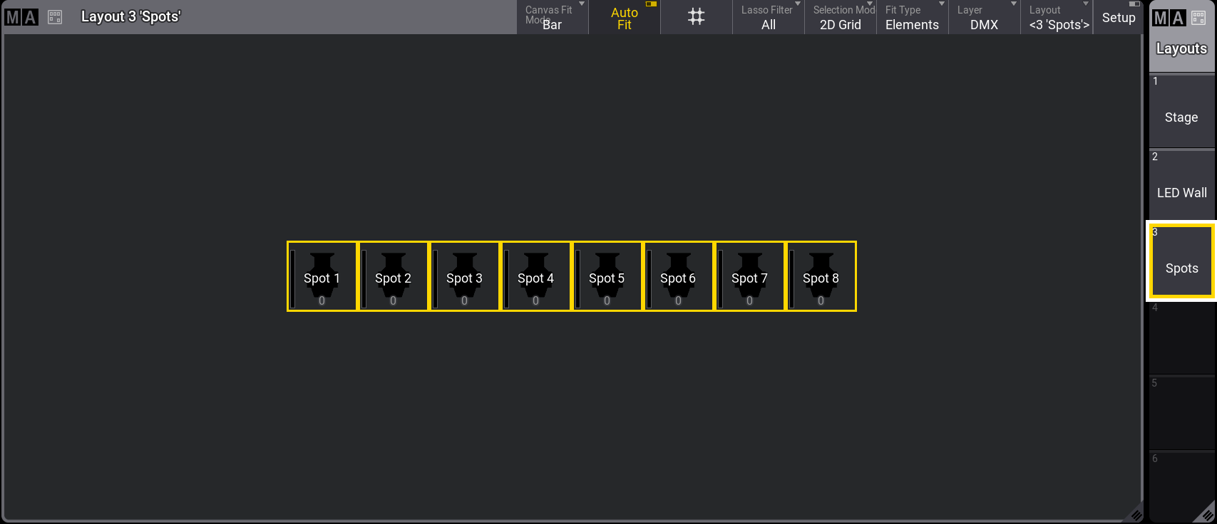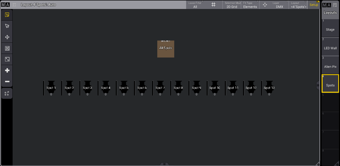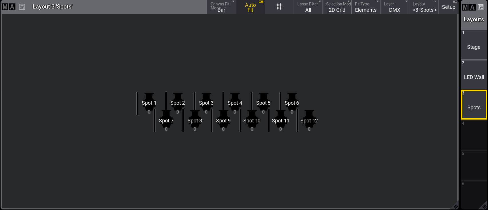 これら10台のフィクスチャは、Spots というラベルの付いたレイアウト3を作成するために使用されています。詳しくは Create a Layout を参照してください。