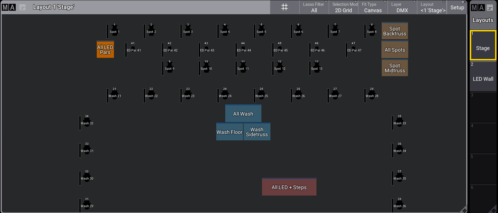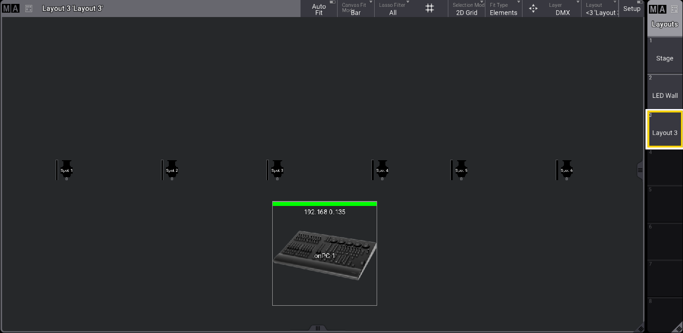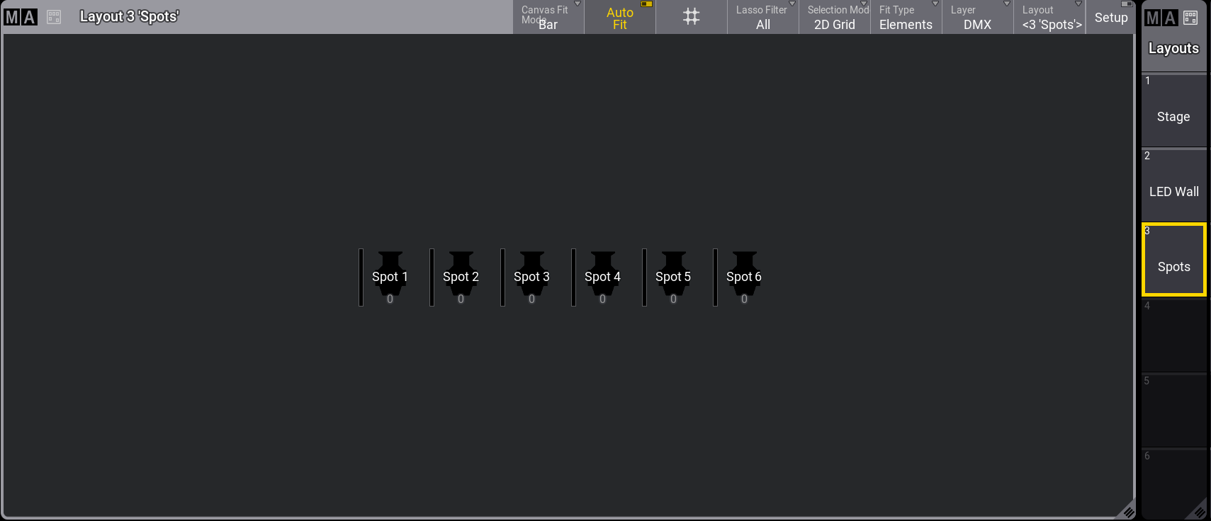 これら10台のフィクスチャは、Spots というラベルの付いたレイアウト3を作成するために使用されています。詳しくは Create a Layout を参照してください。