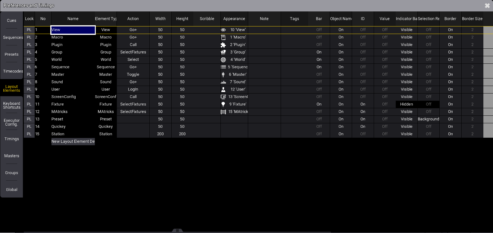 デフォルトのレイアウト要素は、Preferences and Timings メニューで指定できます。