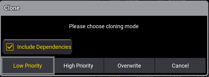 - Clone ポップアップが表示されます。ここには、Low Priority、High Priority、Overwrite、および Cancel という選択肢があります。Please を押してください。詳しくは Clone キーワード を参照してください。