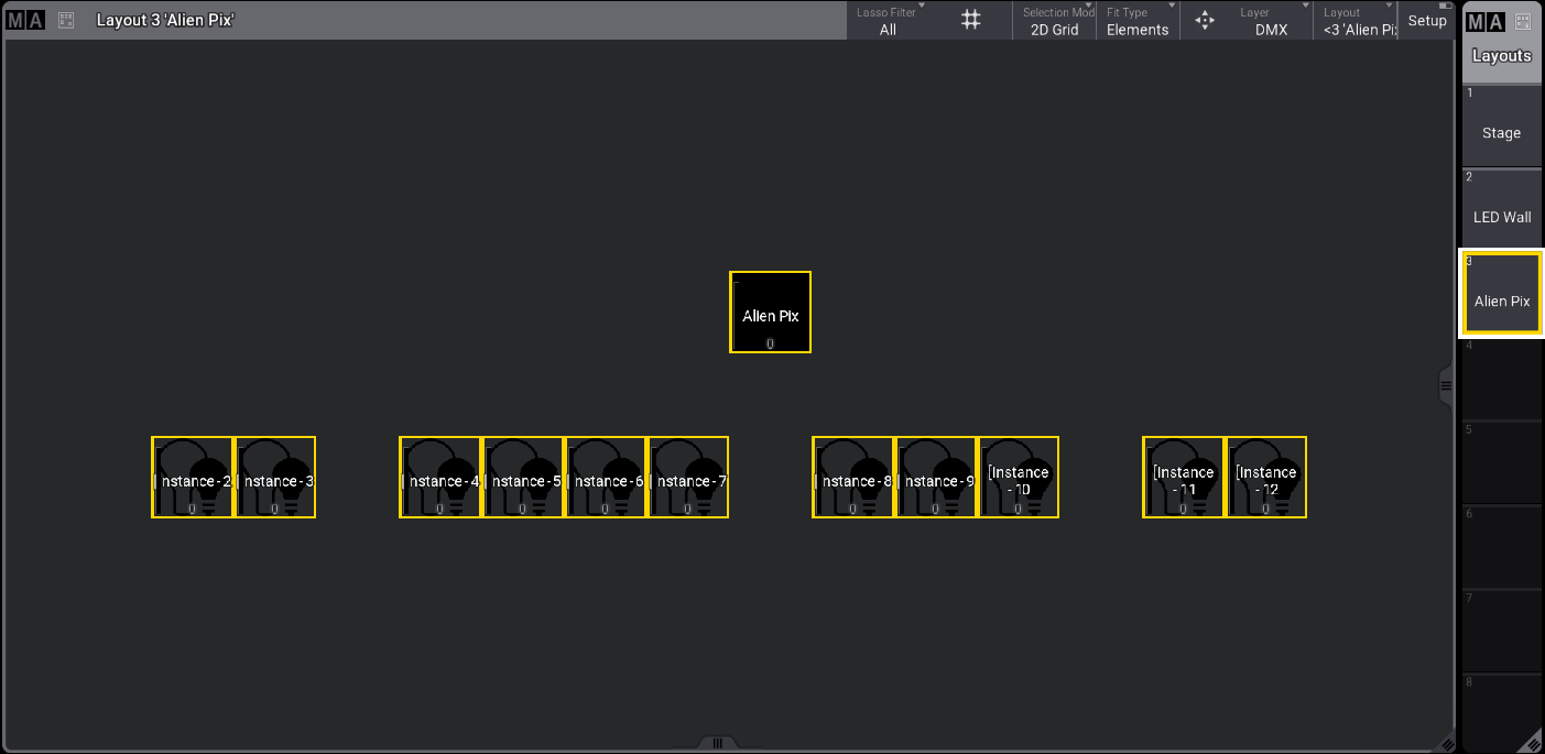 - レイアウトに割り当てるフィクスチャを選択します。選択したフィクスチャの Selection Grid 位置が、レイアウトに割り当てられます。詳しくは Selection Grid を参照してください。