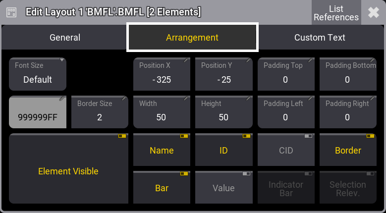 - レイアウト・エンコーダバーの Edit Selected をタップして Layout Element Editor を開きます。詳しくは レイアウト・エンコーダバー を参照してください。