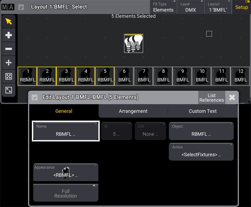 - Name、ID、CID、Boarder、Bar、および Value: レイアウト要素の名前、フィクスチャID、カスタムID、境界線、ディマーバー、および出力値の表示/非表示を切り替えます。