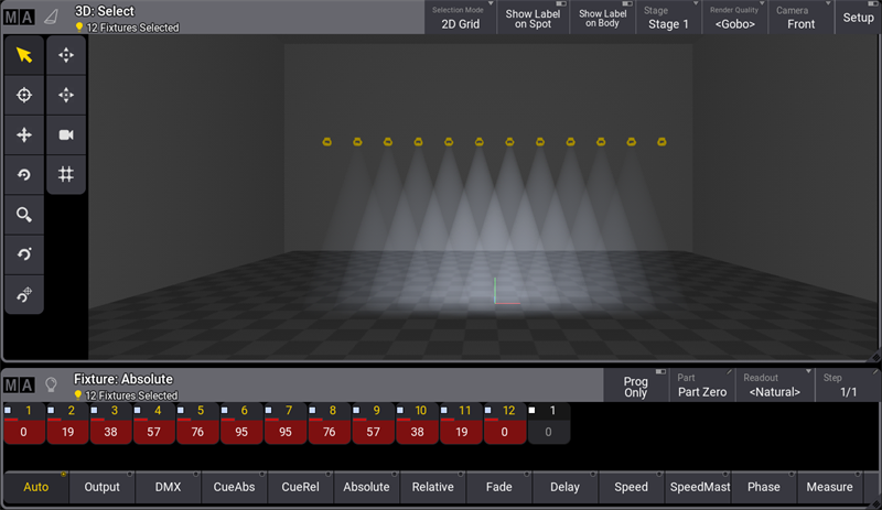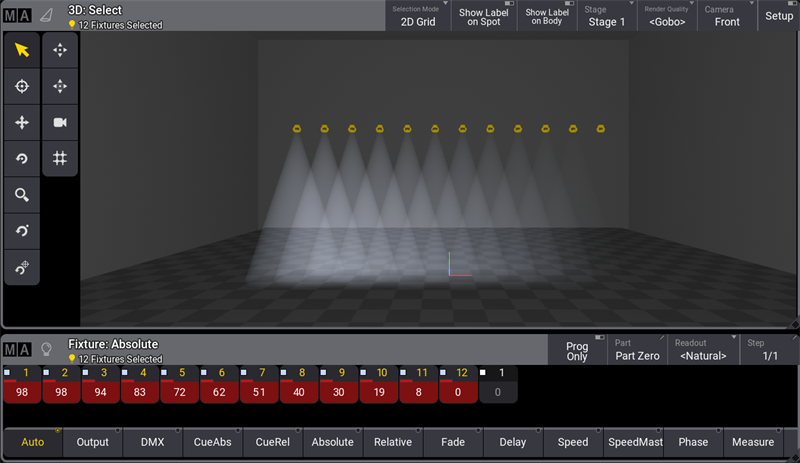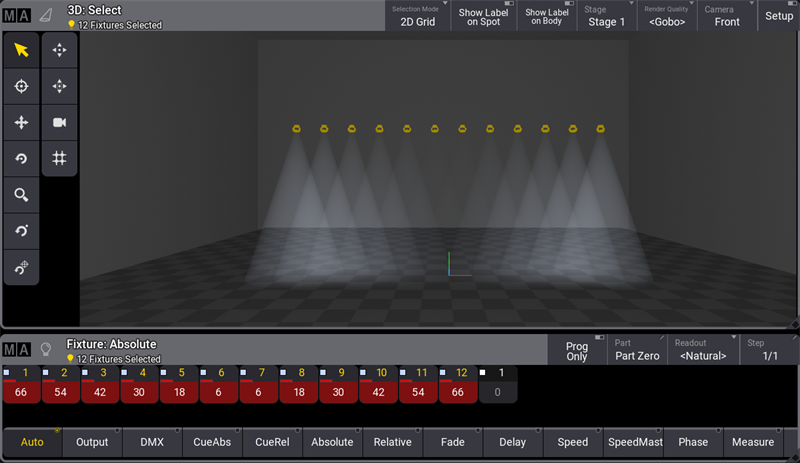 以下の例では、フィクスチャ1〜12が左から右の順でパッチされています。詳しくは ショーへのフィクスチャ追加 を参照してください。