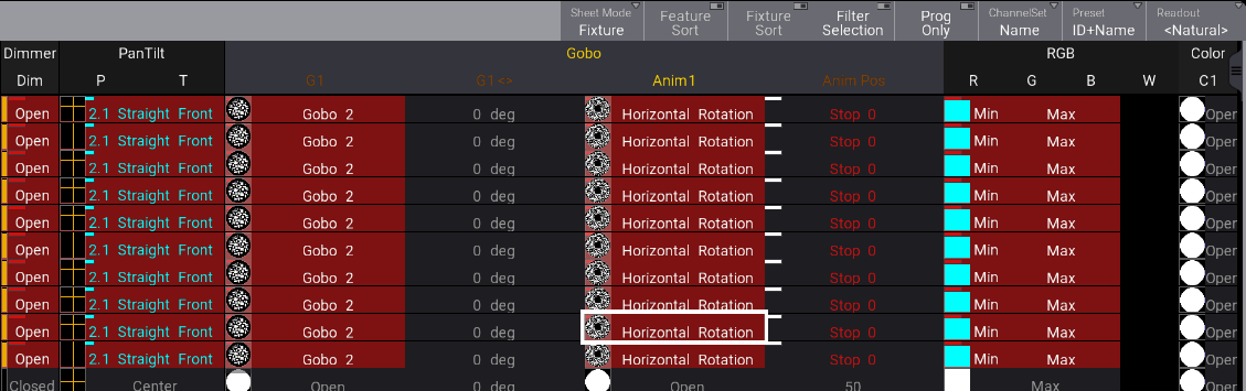 Dimmer、PanTilt、Gobo、RGB、および Color フィーチャのアトリビュート値には、小さなシンボルによるグラフィック表示が可能です。