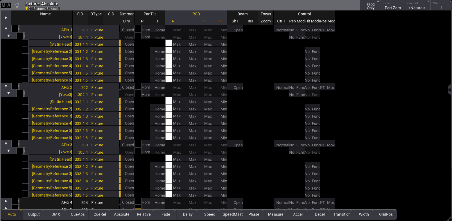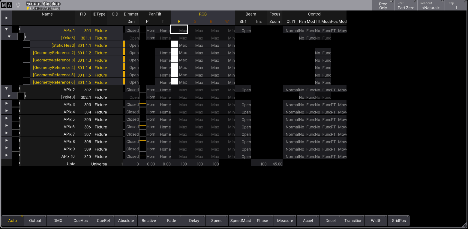フィクスチャを操作して、アトリビュート(例: Dimmer、Pan、Tilt、Zoom など)値を変更するには、まずそのフィクスチャを選択(select)する必要があります。