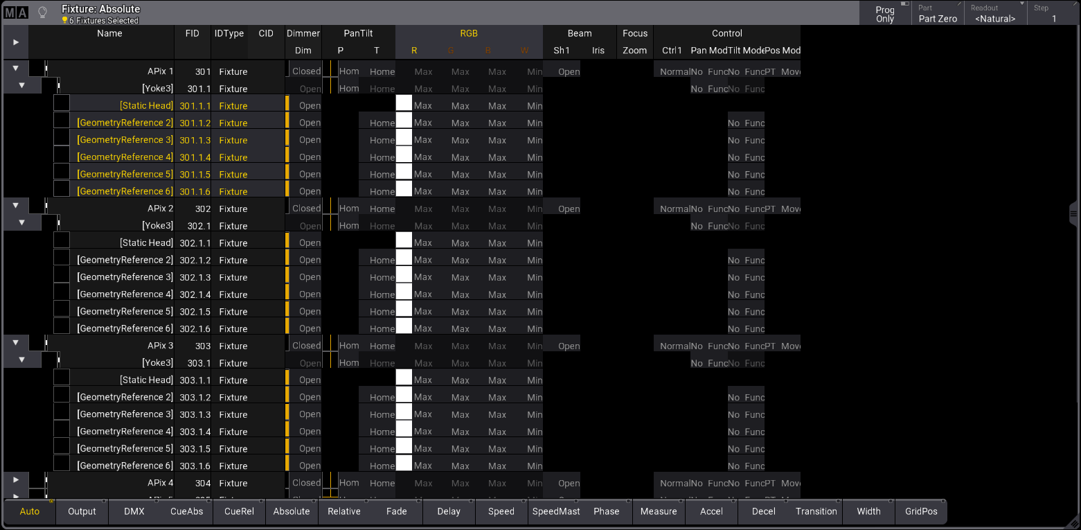 フィクスチャ1〜5が選択されます。選択した5台のフィクスチャは、Fixture Sheet ウィンドウに黄文字で表示されます。