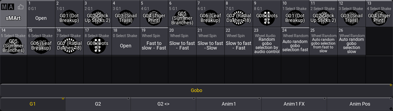 sMArt ビューの下部にはアトリビュート選択バーが表示されます。これによって、現在選択されているフィーチャグループ内で目的のアトリビュートを簡単に選択できます。上の画面例では、Gobo フィーチャグループ、選択されている Gobo Wheel 1 (G1) アトリビュート、そして G2、G2<>、Anim 1、Anim 1 FX、および Anim Pos が表示されています。