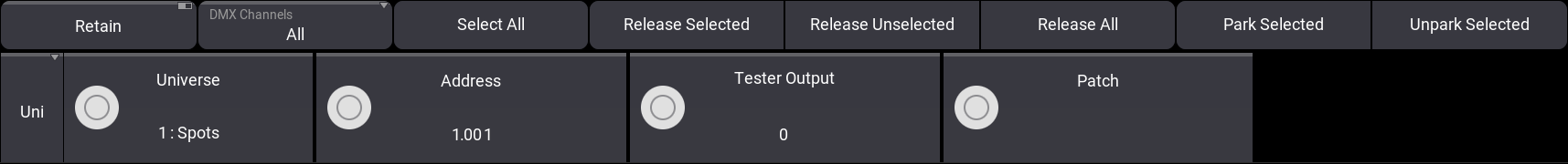 このエンコーダバーを用いると、DMXアドレス、テスト値、および選択したアドレスを既存フィクスチャにパッチするためのオプションに素早くアクセスできます。また上部には、いくつかの便利な機能に素早くアクセスできるボタンの行があります。