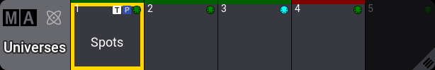 ユニバースにパークされているDMXアドレスがあると、DMX Universe プール に小さな アイコンが表示されます。テスターがDMXチャンネルに影響を与えるユニバースにも、小さな アイコンが表示されます。