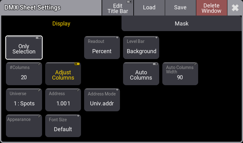 DMX Sheet には、データをどのように表示するかを指定するいくつかの設定があります。