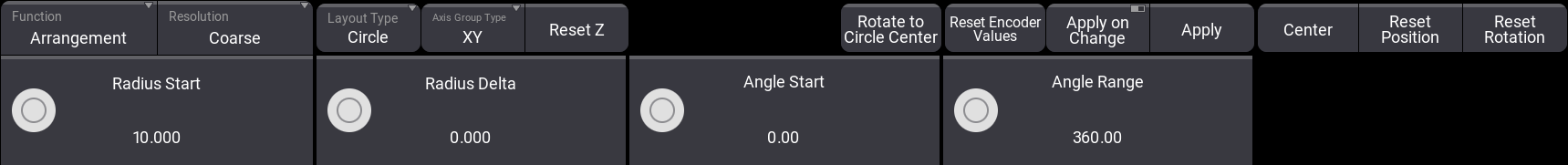 エンコーダは、Radius Start、Radius Delta (Radius が変化する場合)、Angle Start、および Angle Range の設定用に変わります。Angle Start は、先頭フィクスチャのサークル上での位置を設定します。Angle Range は、円弧(360未満の値)または多重サークル(360を超える値)を作成する際に用いられます。