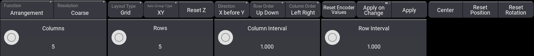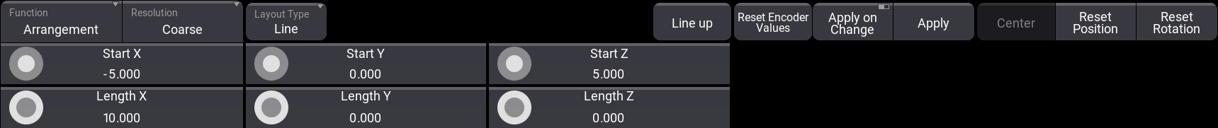 Line 、Grid 、および Circle という3種類の配置タイプがあります。タイプを切り替えると、エンコーダバーで利用できるボタンと、エンコーダの機能が変化します。