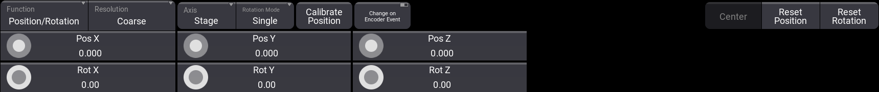 エンコーダには、選択されているフィクスチャに応じて関連する値が表示されます。エンコーダを回すと値が変化し、選択されているフィクスチャの位置や回転が変わります。