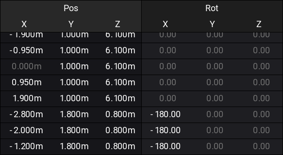 Patch では、各フィクスチャの行に対して、Position および Rotation 値の列があります。
