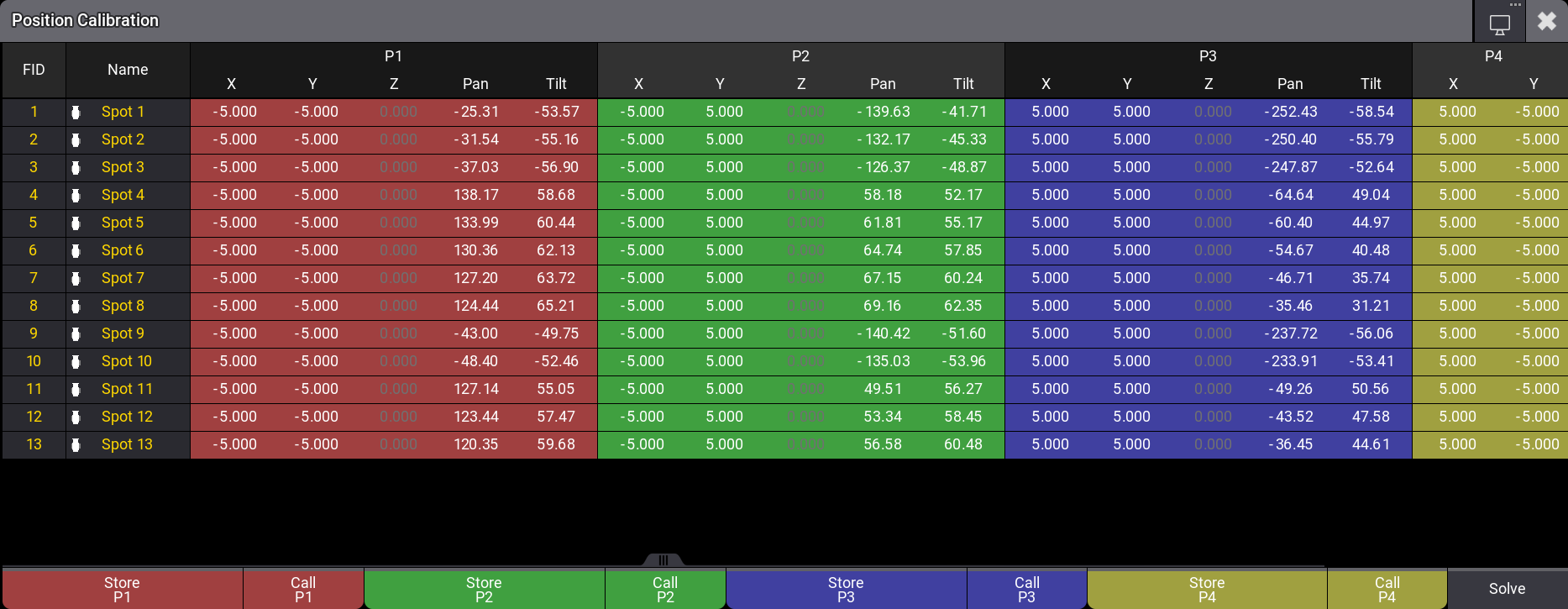 下部には、各ポイントに対する Pan/Tilt 値を保存したり、それを呼び出したりするためのボタンがあります。また Position の計算を開始するために必要な Solve もあります。