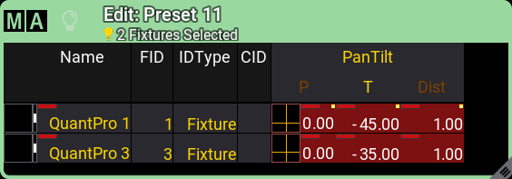 | MAgic プリセットをプログラマに呼び出しても、プリセットへのリンクは作成されません。フィクスチャ値はセレクションに基づいて計算され、ハード値として保存されます。MAgic プリセットへの参照を保持する唯一の方法は、プリセットがレシピで使われている場合です。詳しくは レシピ・プリセット を参照してください。 |