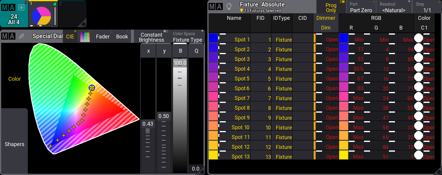 | Universal Color を呼び出す際には、カラー・エンジンによって変換されます。例えば、7色LEDを用いて色を作成し、そのデータを Universal で呼び出した場合、RGBA フィクスチャでも同様の色が呼び出されます。 |