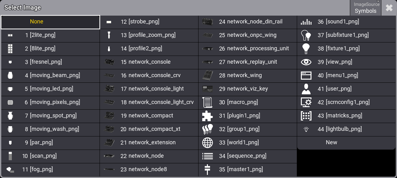 デフォルトでは "Images" プールがソースとして用いられますが、これは変更できます。ImageSouce ボタンに "Symbols" と表示されるまでクリックしてください。それにともない、ポップアップは大きくなるでしょう。