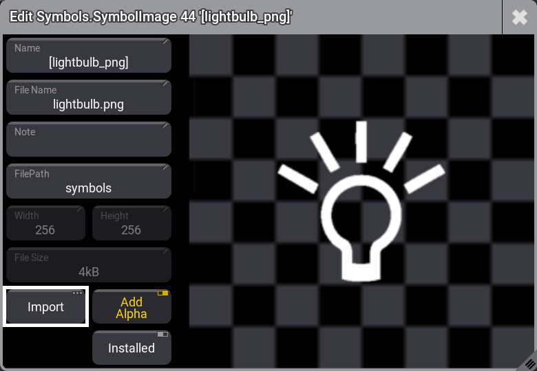このポップアップで Import ボタンをクリックすると、Select Image for Import という別のポップアップが開きます。一覧スクロールするか、Filter 欄に lightbulb と入力し、"lightbulb.png.xml" というシンボルを見つけてください。それを選択して Import をクリックします。