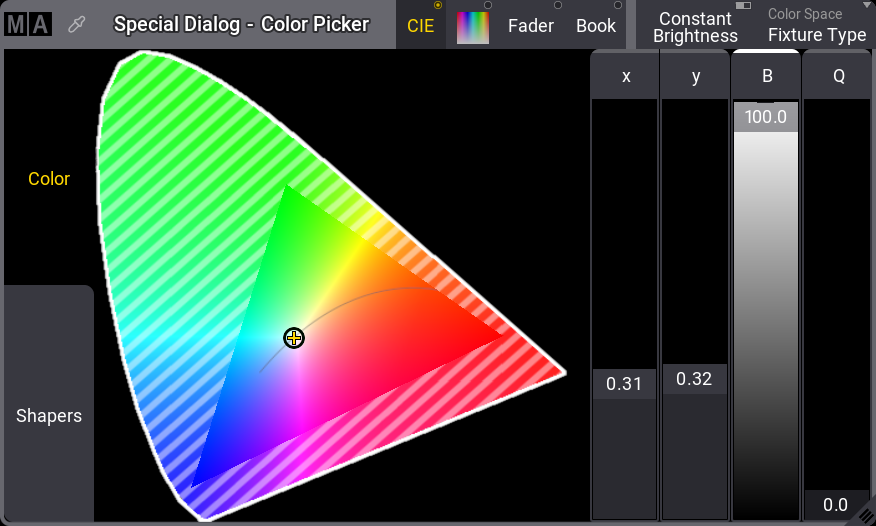 ウィンドウの左側には、Color および Shapers という2つのタブがあります。Shapers は、電動ビームシェイパー機能を備えたフィクスチャで使用されます。このフィクスチャにはないため、Color タブだけを見ていきます。