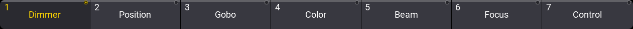 フィクスチャ101(またはグループ6)を選択すると、各ボタンの上部にあるバーが(灰色から赤に)変化する場合があります。これは、選択したフィクスチャで使用できるフィーチャグループを示しています。プログラマをクリアしてフィクスチャ1を選択すると、バーが赤に変わるのは 'Dimmer' ボタンだけであることが分かります。
