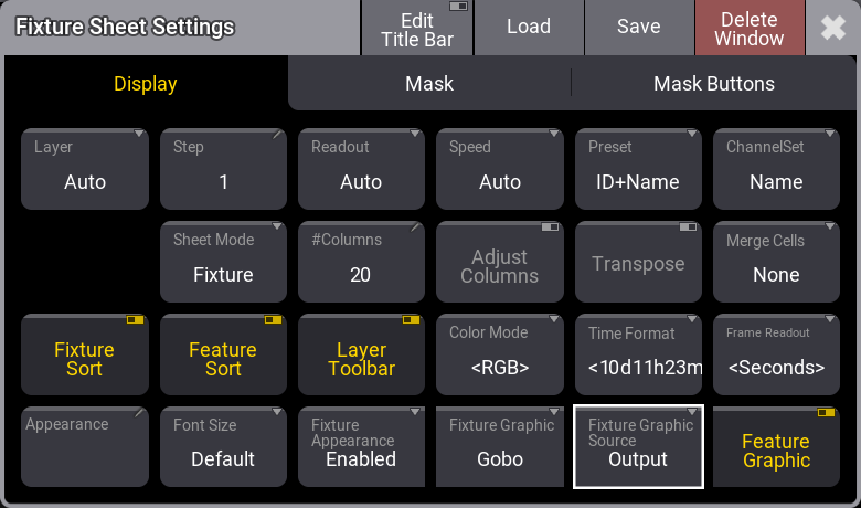 また、'Fixture Appearance' を "Enabled" に、'Fixture Graphic' を "Gobo" に、'Fixture Graphic Source' を "Output" に設定してください。