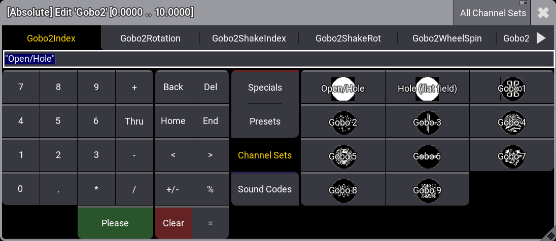 これは、選択したフィーチャに応じて内容が変わる動的プールになっていて、定義されているチャンネルセットにアクセスできます(上例では "Gobo" がフィーチャ)。