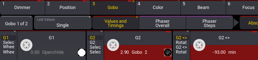 1つのエンコーダで複数の機能を制御する場合、それらを異なる値のセクションに分割できます。電卓の上部にはいくつかのタブがあり、2番目のタブでも同じゴボを選択できますが、ゴボ回転モードになります。