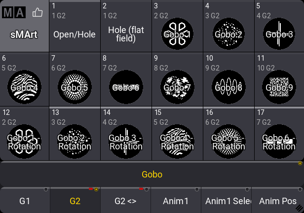 2番目のエンコーダは、2番目のゴボホイールでゴボを選択します。多くの場合、ゴボはフィクスチャタイプで定義され、種々の「ホイールスロット」を持っています。これらの定義には、実際のフィクスチャのゴボに対応する小さな画像が含まれています。