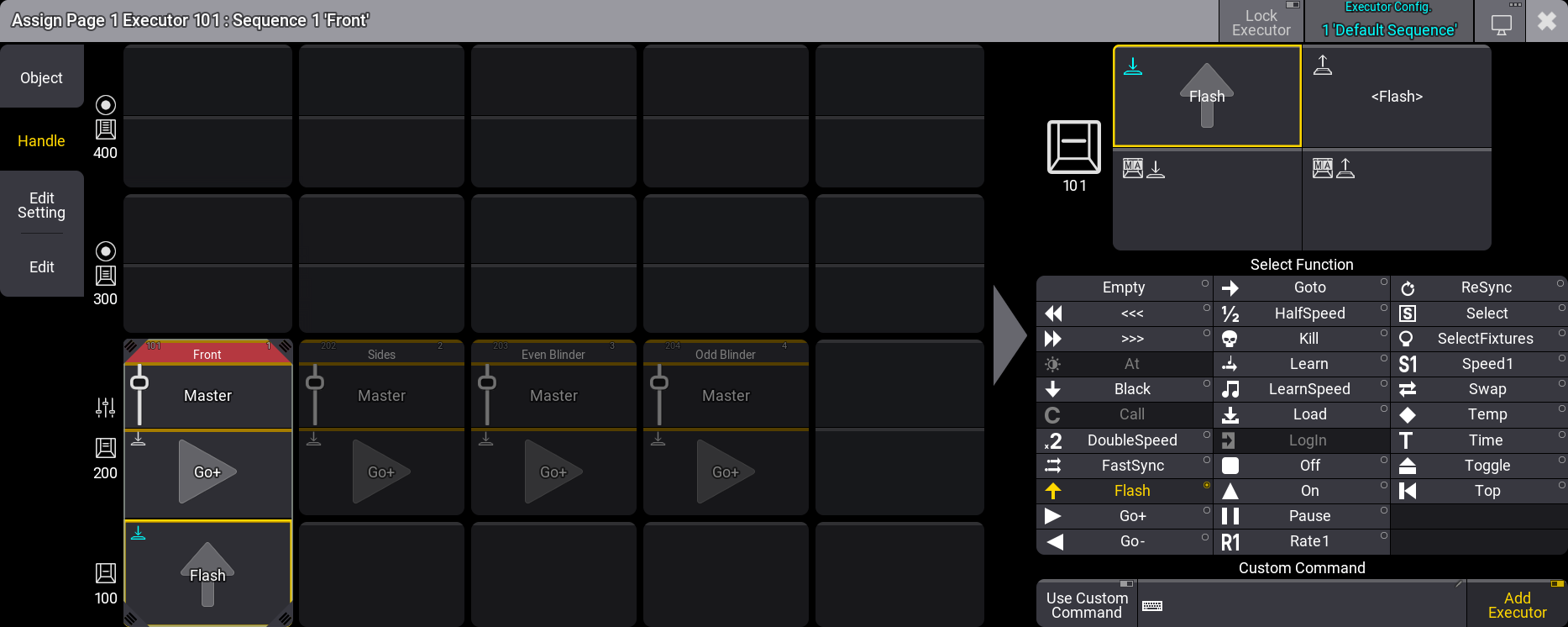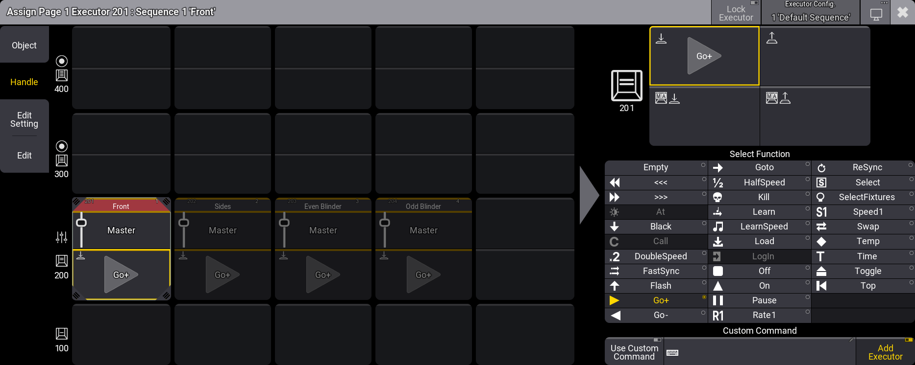 エクゼキュータ・ボタンを押すと自動的に新しいシーケンスでキュー1が作られ、そのシーケンスがエクゼキュータ202に割り当てられます。