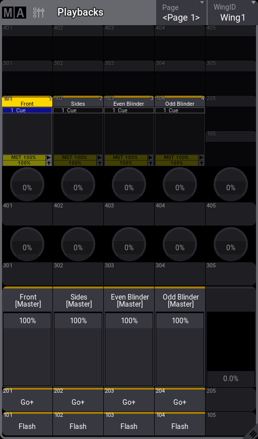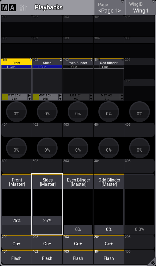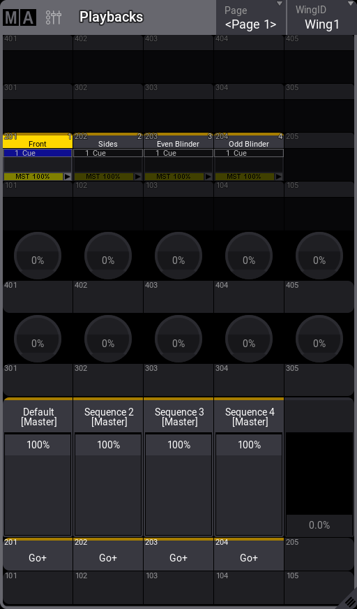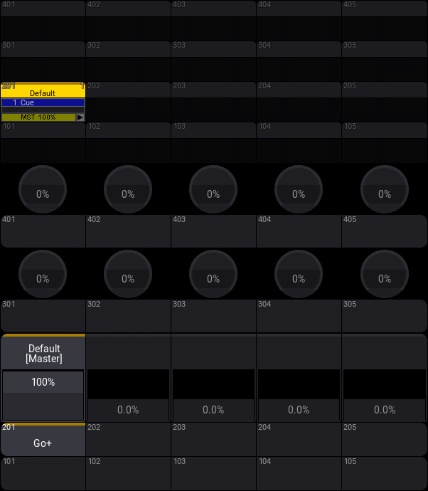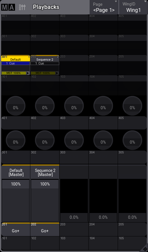 シーケンス1は、すでにエクゼキュータ201に割り当てられているので、左のエクゼキュータ・フェーダを動かすことができます。これは、シーケンスのマスター・インテンシティも制御します。マスター・エリアのマスターも動くことに注意してください。どちらのフェーダも、シーケンス1に対して同じように働きます。
