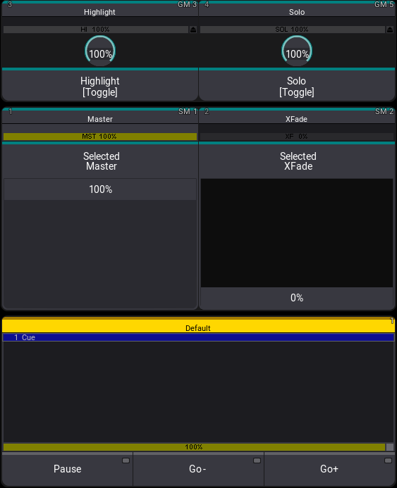 マスター・エリアは常に、選択されているシーケンスを制御します。左側フェーダのデフォルト機能は、出力マスターです。上下に動かすことで、フィクスチャの出力レベルを調整できます。