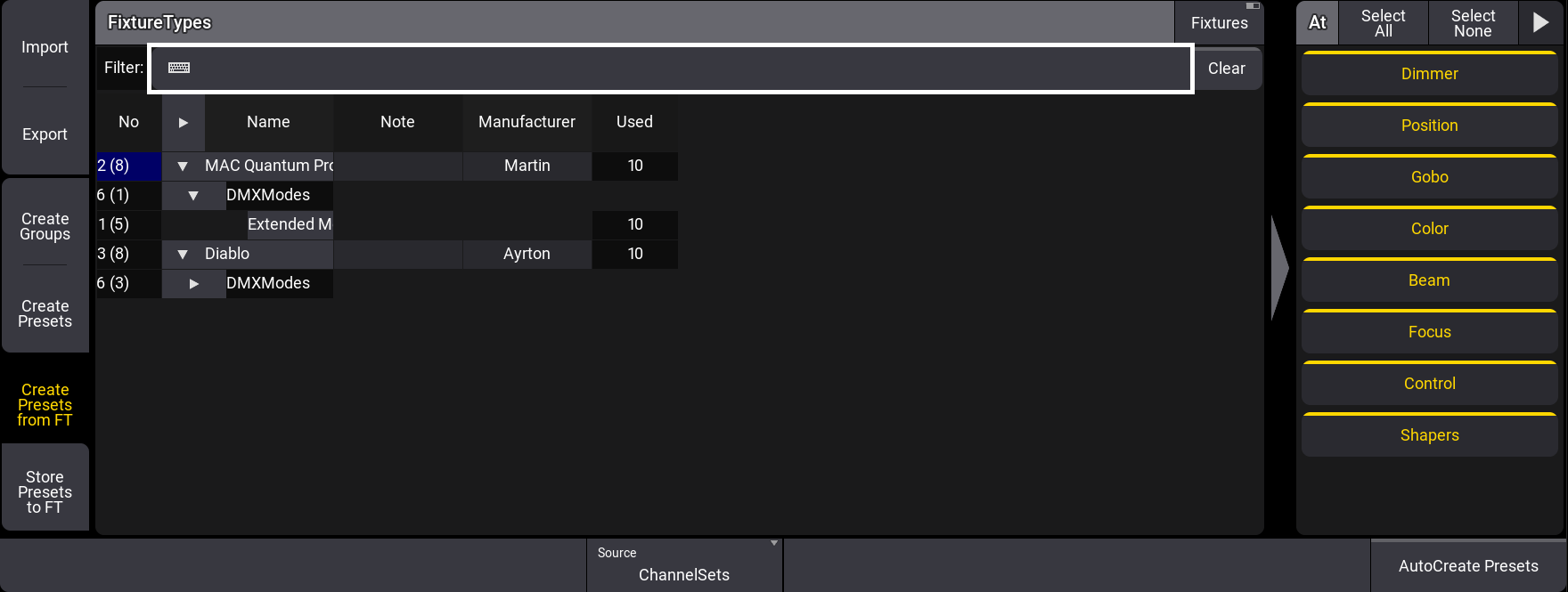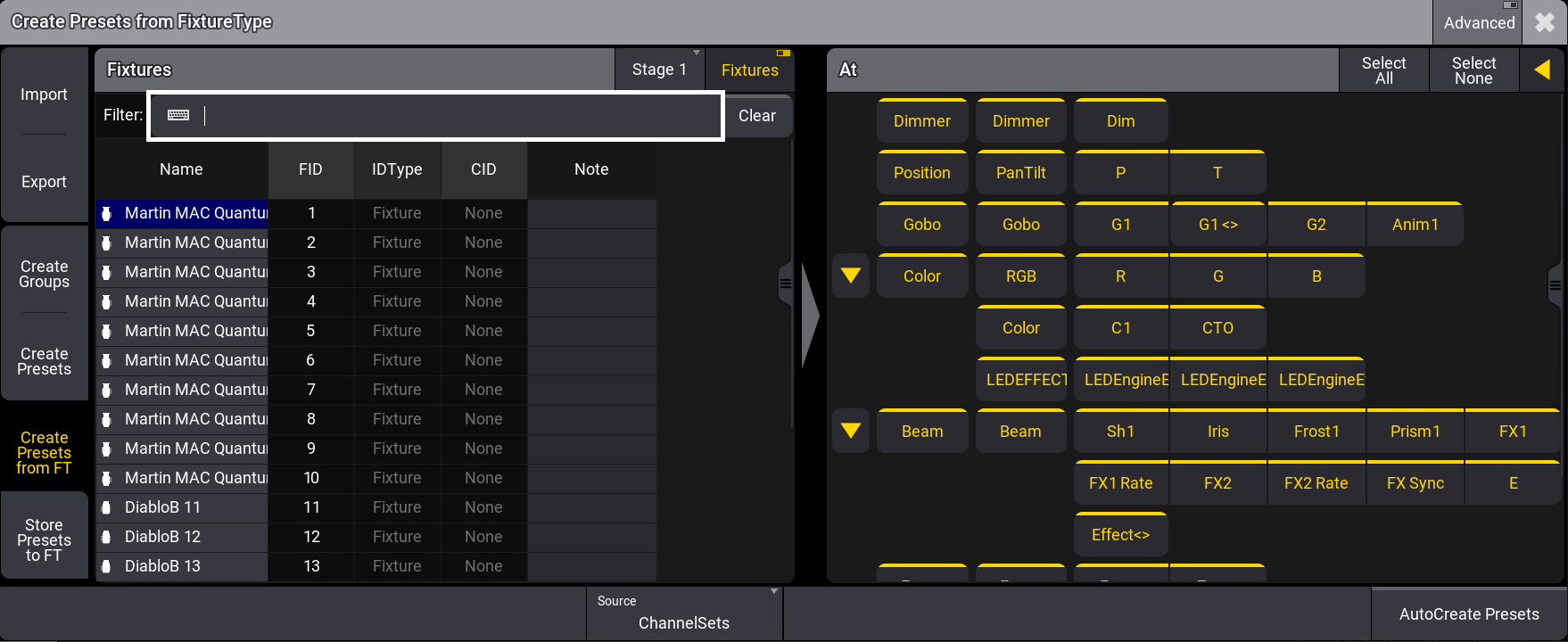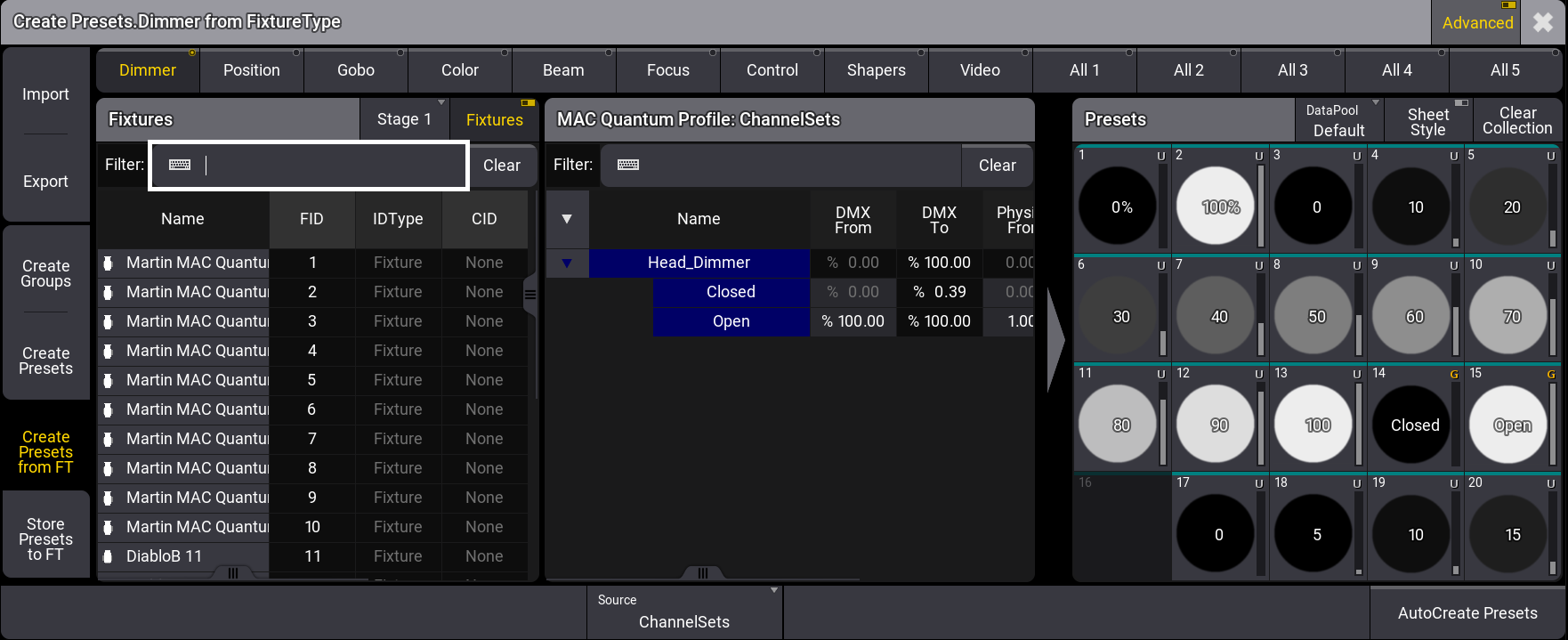 Create Presets from FT メニュー - Fixtures と At Filter が有効