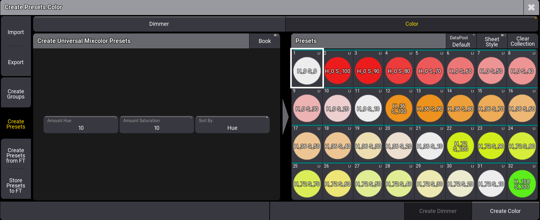 Color プリセットは、Hue と Saturation の組み合わせで作成されます。