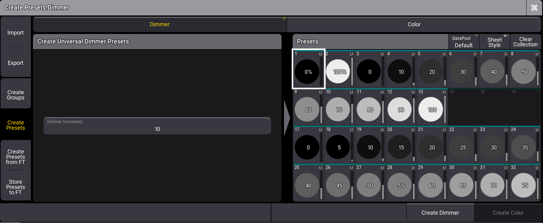 Create Presets.Dimmer メニュー