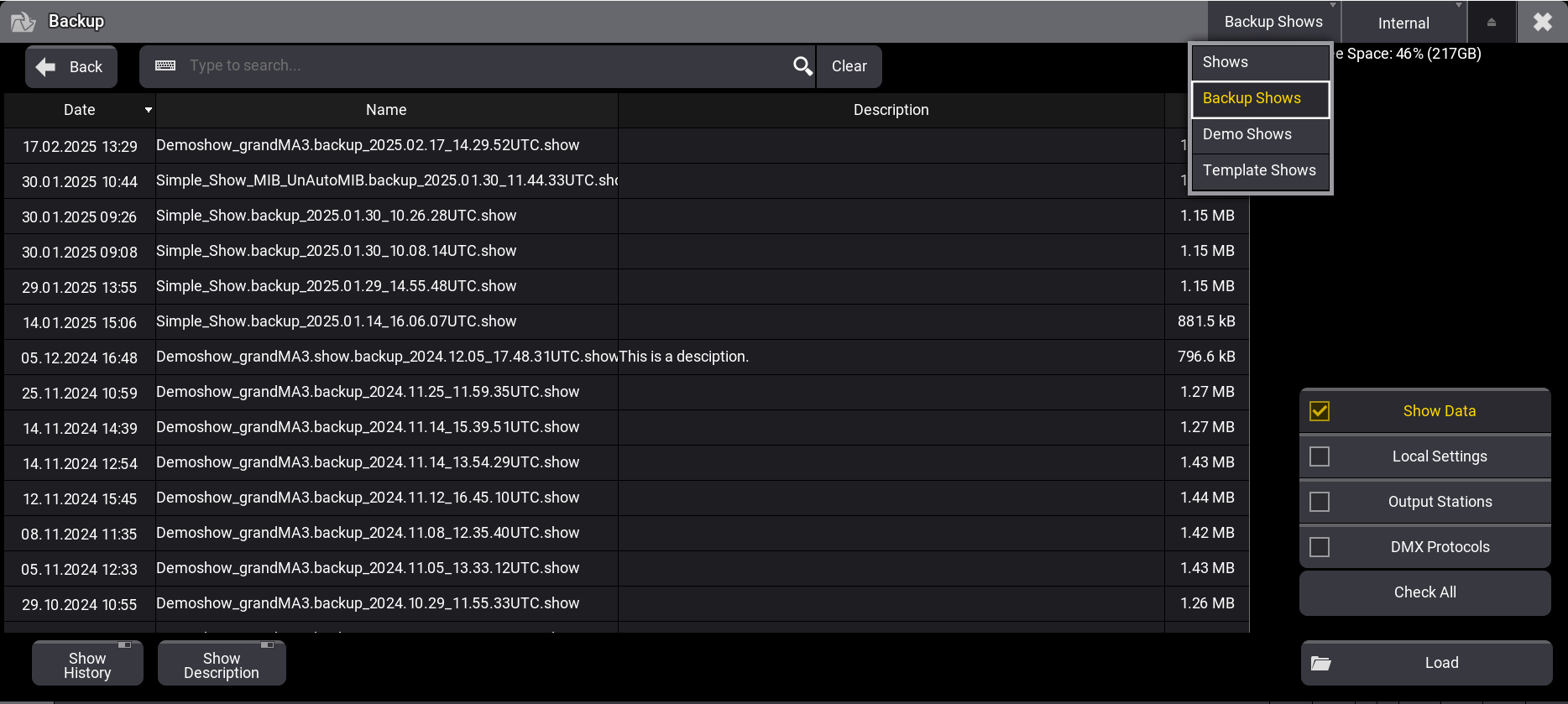 ショーファイルは複数のフォルダに分類されています。Shows には通常のショーファイルが保存されています。Backup Shows には、ショーファイルを保存する際に自動的に生成されます。Demo Shows は MALighting によってあらかじめ定義されたショーファイルで、Template Shows にはユーザが追加できる定義済みのショーファイルが含まれます。