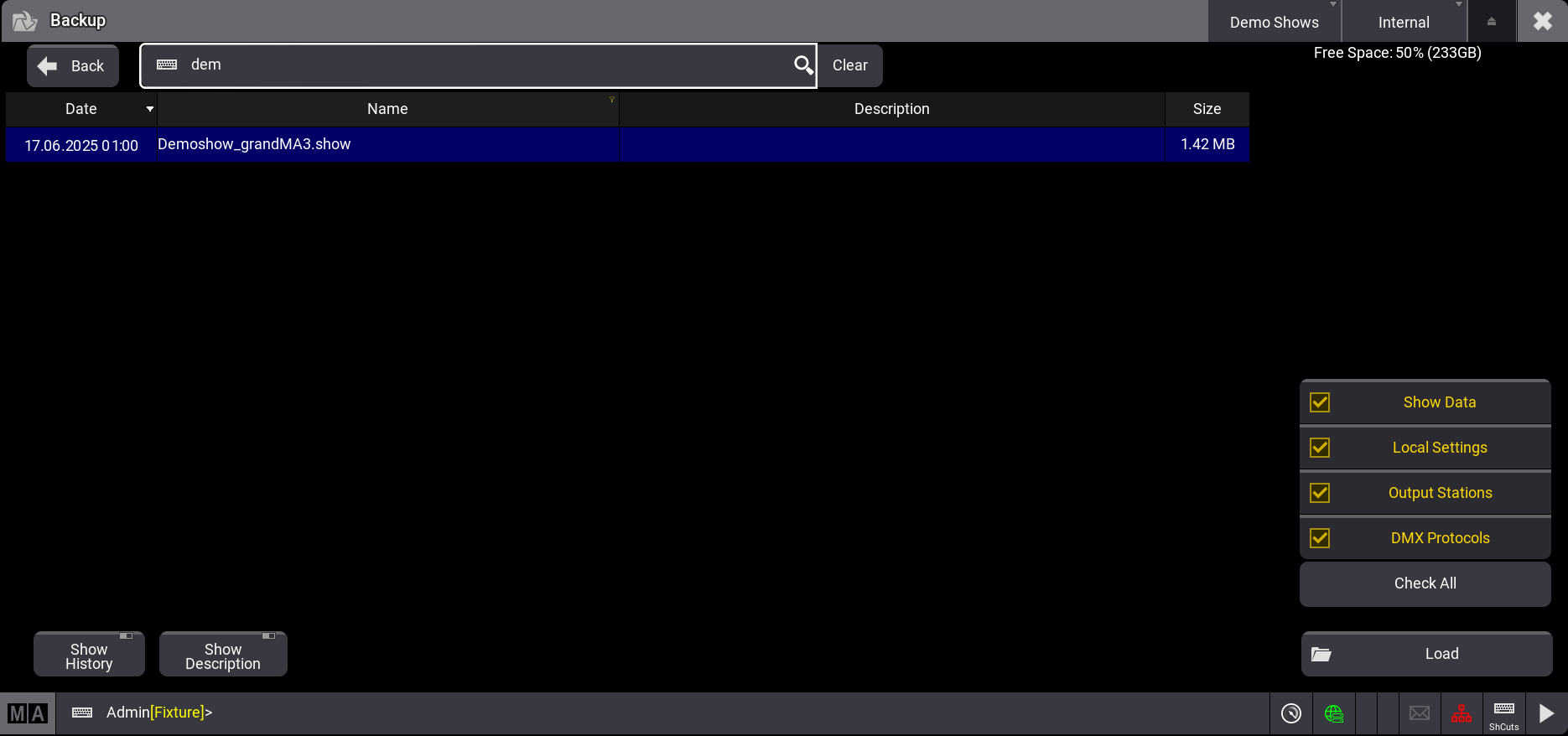 - Demoshow_grandMA3.show をタップします。